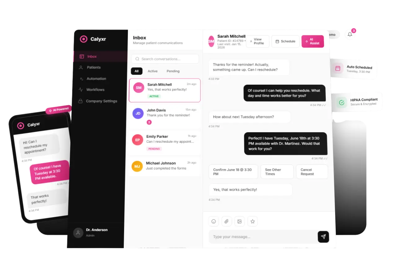 Automate Patient Scheduling, Reminders, Data Collection, and Payments. Transition from fragmented tools to a HIPAA-compliant and AI-driven unified engagement platform that operates 24/7, so your staff can focus on patient care.